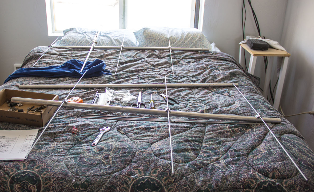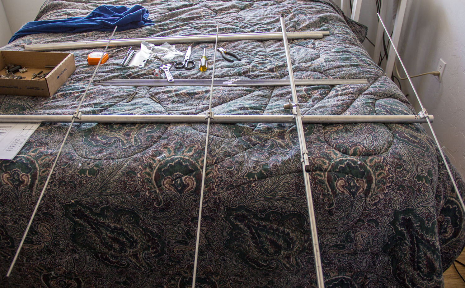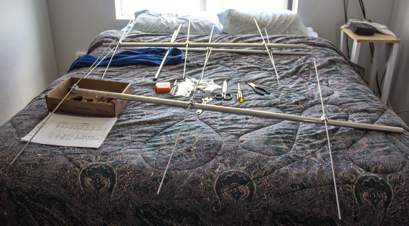 Because it was still somewhat cold outside, I put the antenna together in my home. Its a 12 foot boom length that is in 3 sections. Each 4 foot long. Easier to get it out of the house and up on the the roof in 3 pieces, and assemble up there. This was the back of the boom.