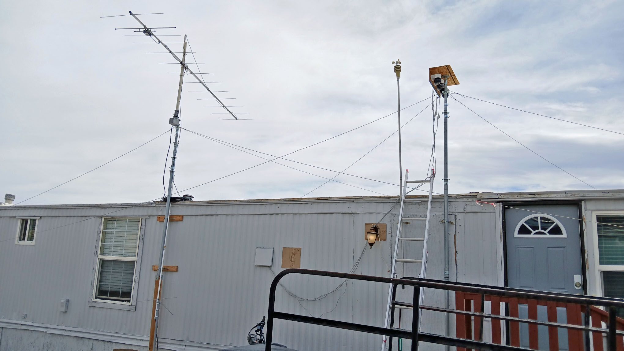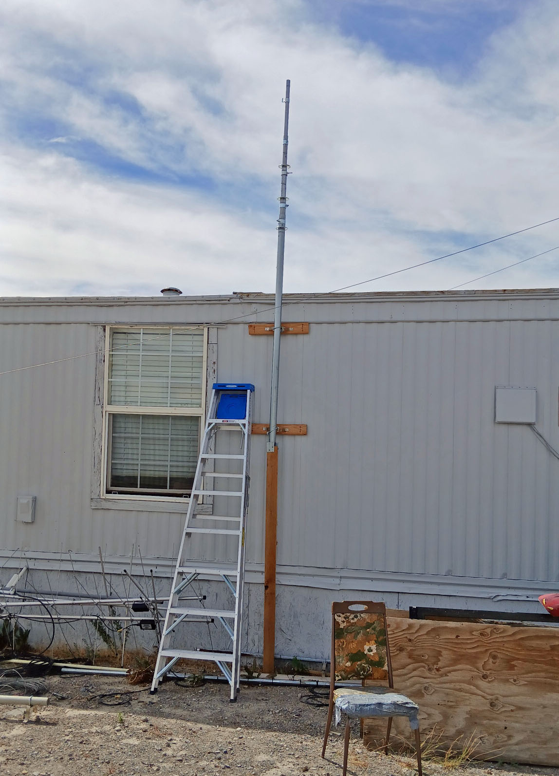 August 9th, 2025... Have the 4 lengths of guy wires in place for each of the antenna, and for security cameras. Still have to straightern all the elements on the antenna. It does git stupid windy around here a lot! Of course, I do still have my little weather gauge up there also.