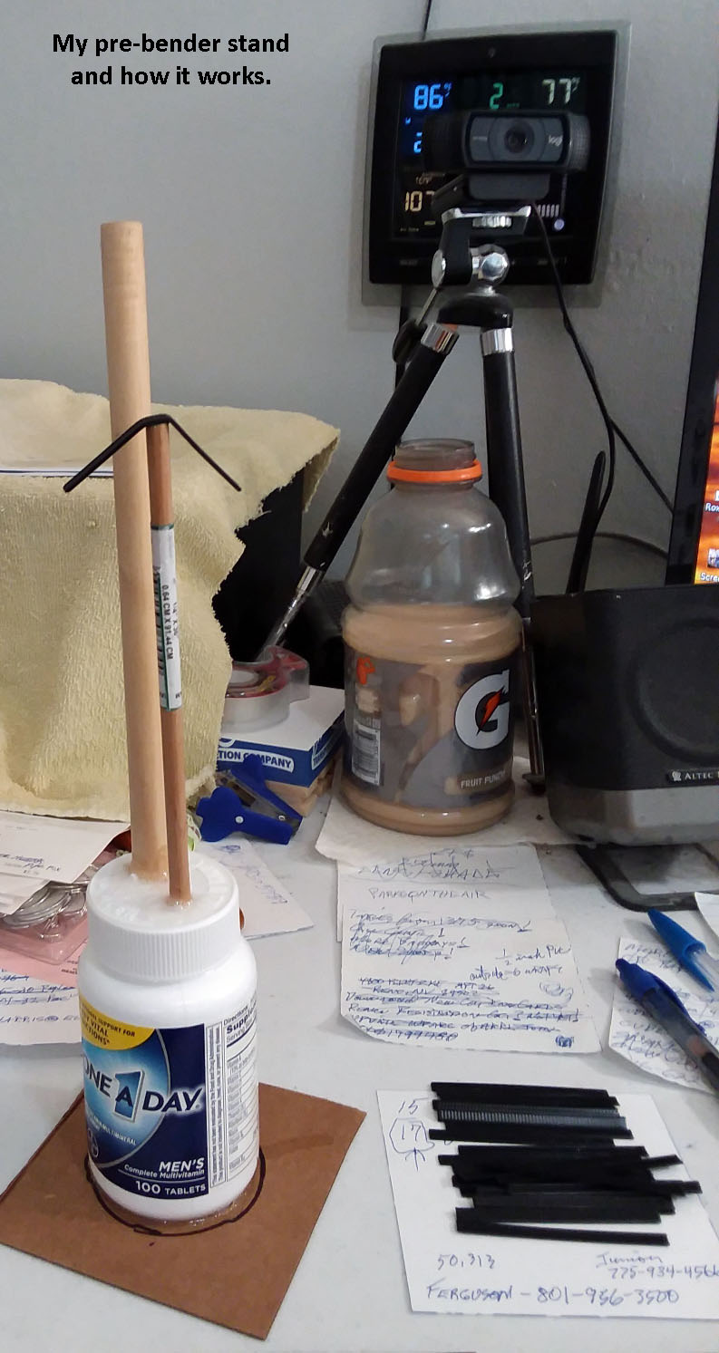 The stand for pre-bending the zip-ties. Cardboard base to keep it from tippin over.. some anyways.