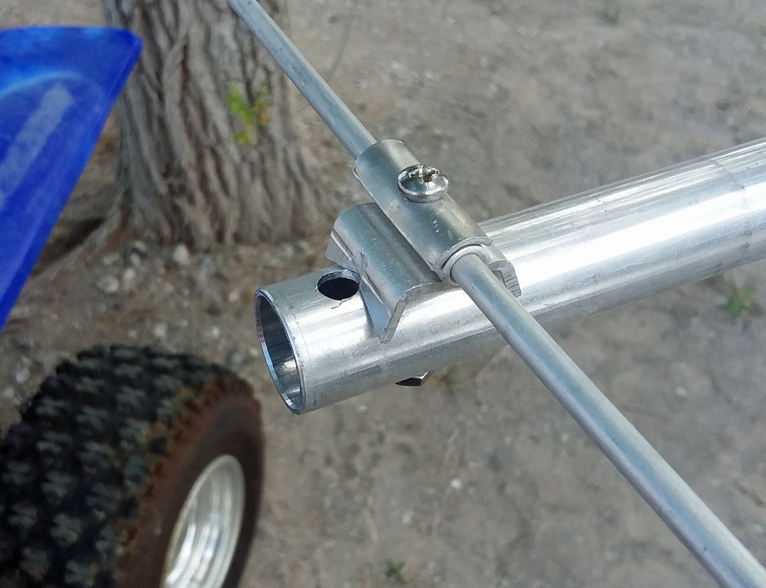 OK.. Once I had a few dayz to think about a plan of attack on the 10 element beamer, once a few somewhat nicer and cooler dayz happen to come along, so I got after the first part that I needed to git done. Got one of my 10 element beams off the roof and brought it down. Mounted it to my antenna tripod stand and got after it. The first thing I did though, was drill through the boom mast where the 3 boom parts join together and put a small bolt through it so that it stays straight! All Cushcraft supplies (AR148-10S) is 2 hose clamps for it. Wild winds do not hold it all keeping lined up! Next.. I hand drilled 1/4 inch holes through the boom just behind the rear of each element. Yes.. as you will eventually see in the pics, the 1/4 inch wood dowels are not exactly straight up and down. This is just a test, right? :-) This is back of the driven element.
