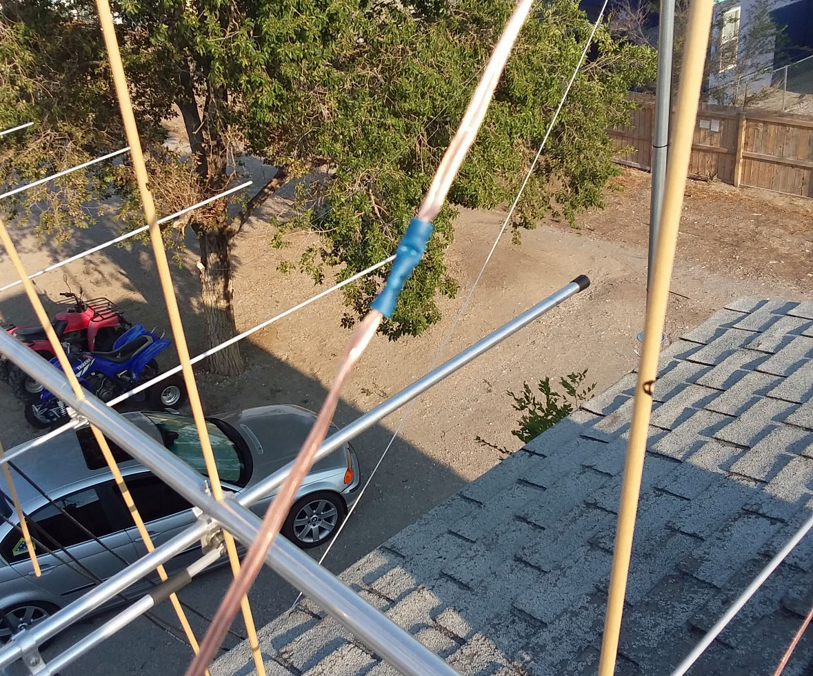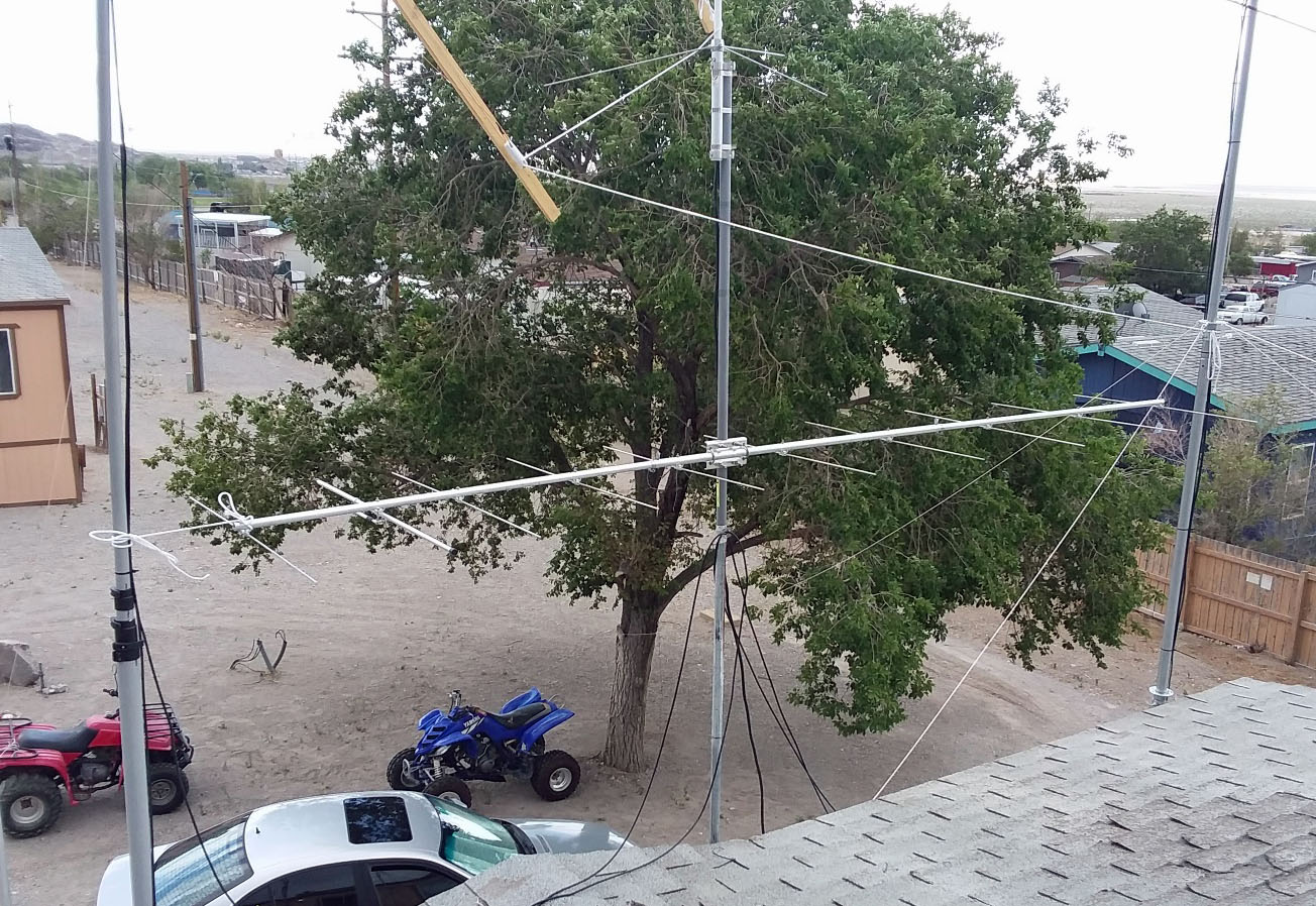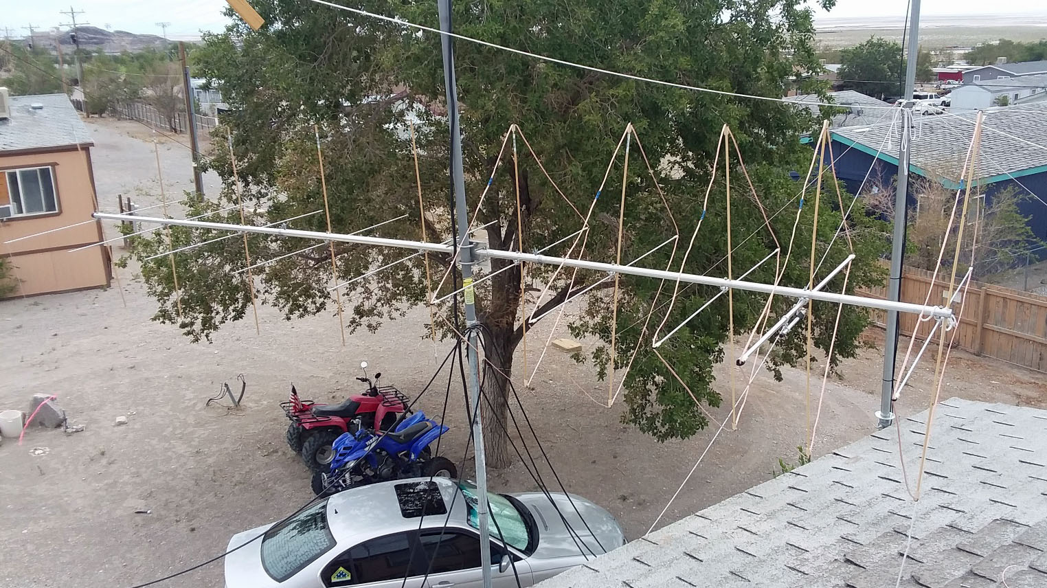 Another view of it all here. More wire needed for the last front director to finish it and check SWRs testing, etc. Roughly where it is at, with everything near it and having it pointed towards the tree, SWRs were at 1.3-1.4 on it at 144.200-144.250. Back when it was up at 50ft, it was 1.2 from 144.200-144.250. Thats to be expected down this low with everything in the ways.