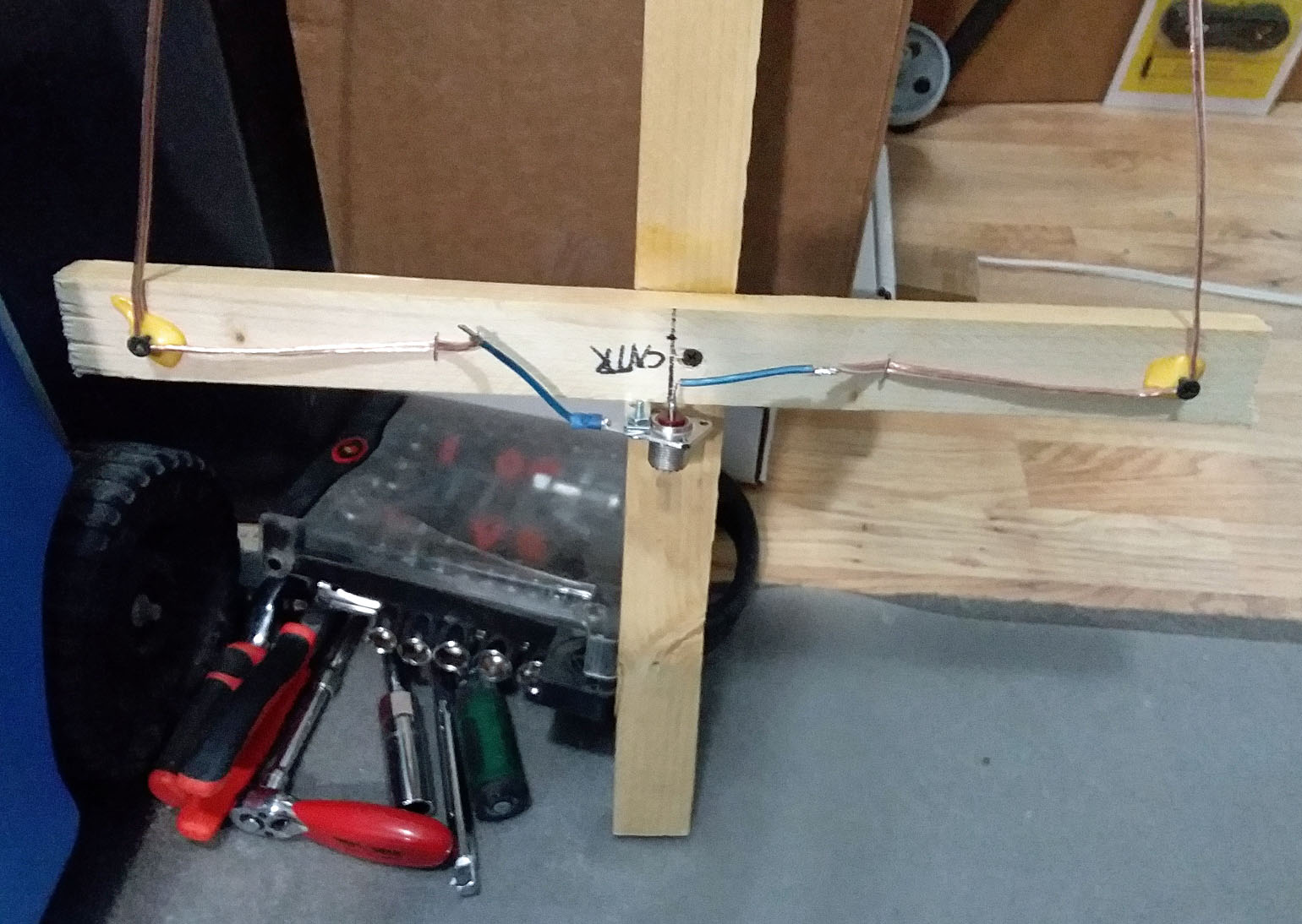 As of July 13th, 2021.. I was in the process of building one of those 2 meter hour glass antennas, that I will use for 2 meter SSB and digital modes within that band. Time will tell if it works right, or not. As of July 16th, I finally got the thing put together and up at temporary testing place. Have not used it yet as to transmitting or recieiving. Was able to get the SWRs down to 1.4 on it at 144.200, even with where it is temporarly at by other stuffs. NOTE.. the pics below, were taken with my cell phone, and not my real camera.. FYI.