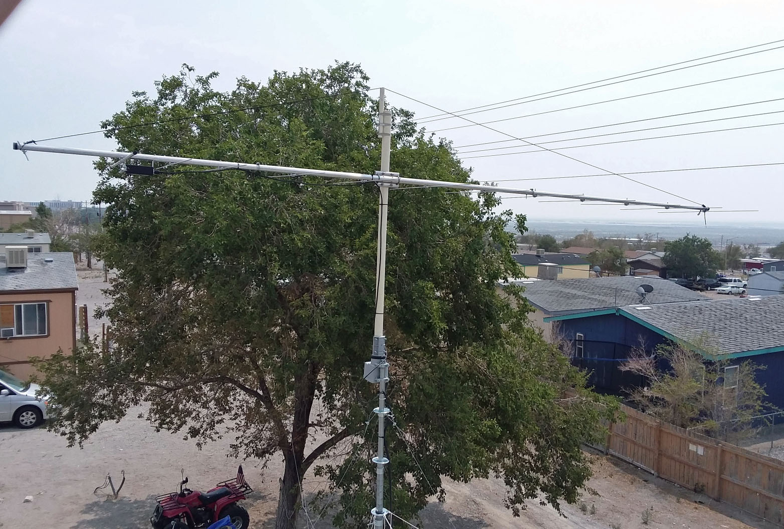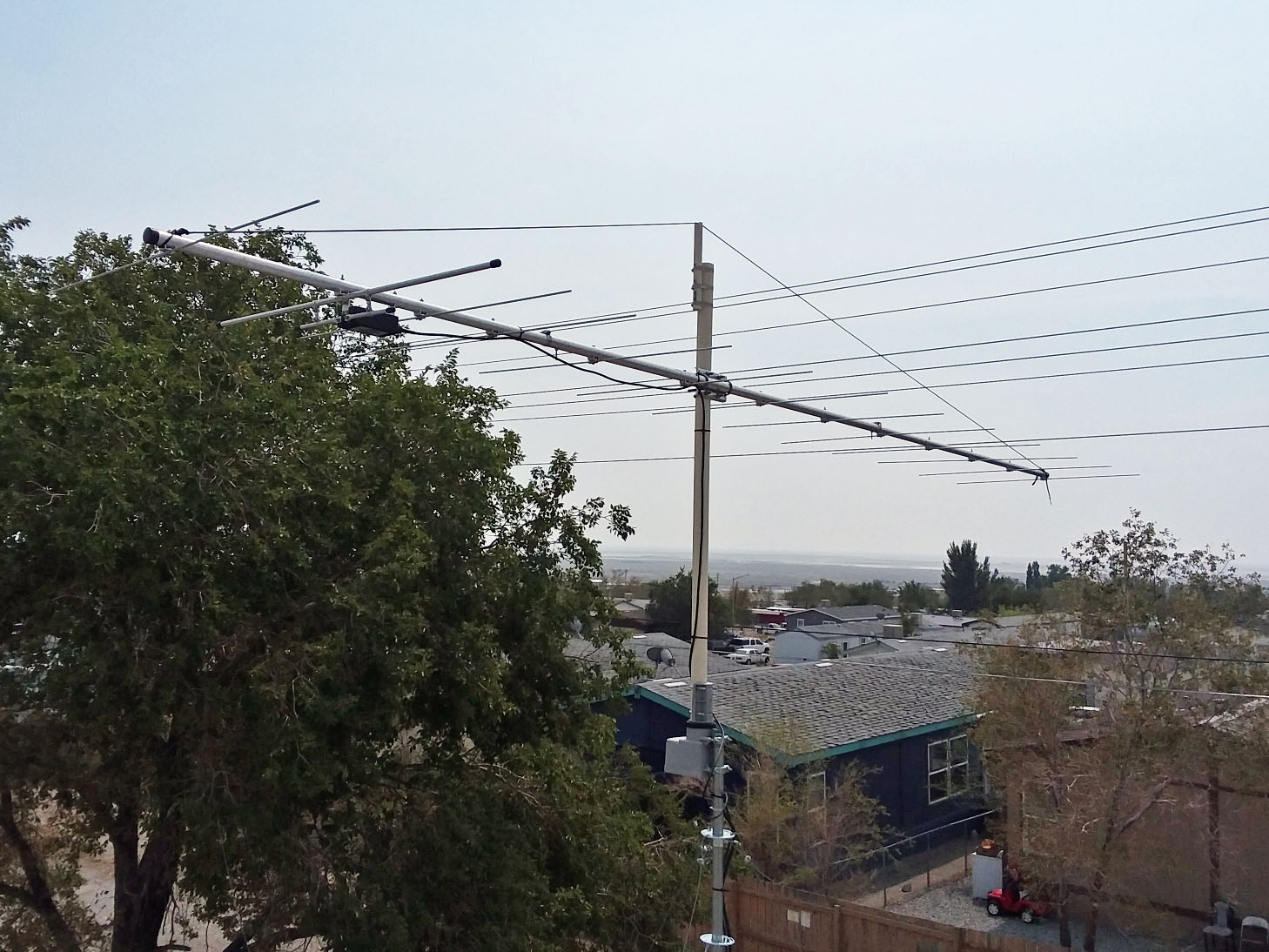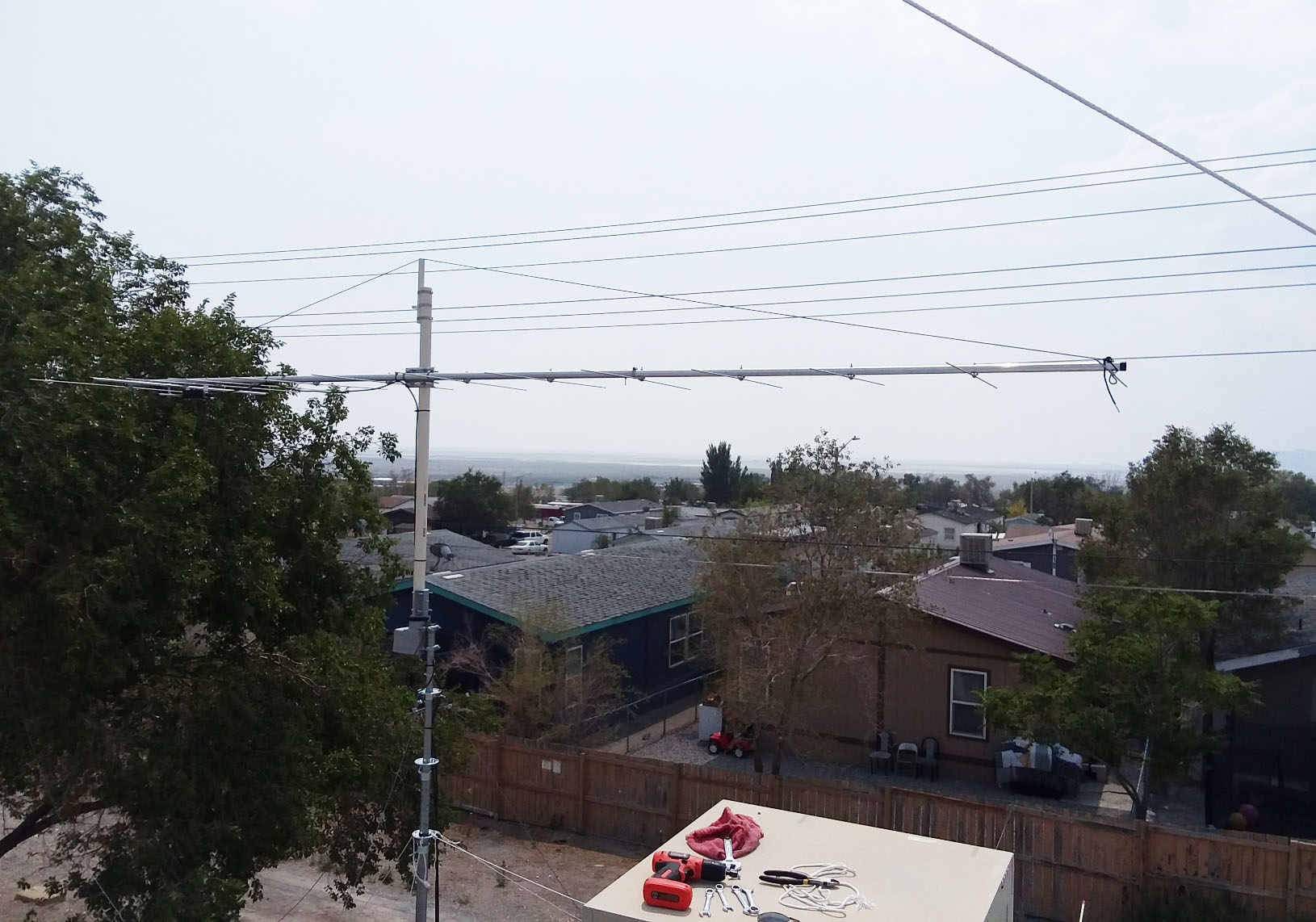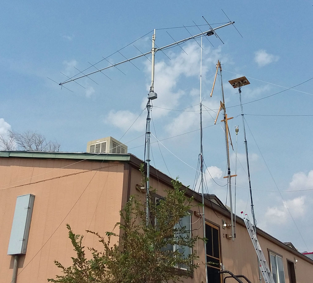 I lowered my 13 element beam down for repairs. The mast had spun loose in the rotor mount over time and with strong winds. Last time I had it down, I forgot to pin the mast and rotor so it would not spin like that. Live n learn I spoze. Beam was about 45 degrees off where I center started it at months ago. Plus, have new style antenna coming in the next week, an 8 element 2 meter cubical quad that I will use in place of the 13 element beamer.