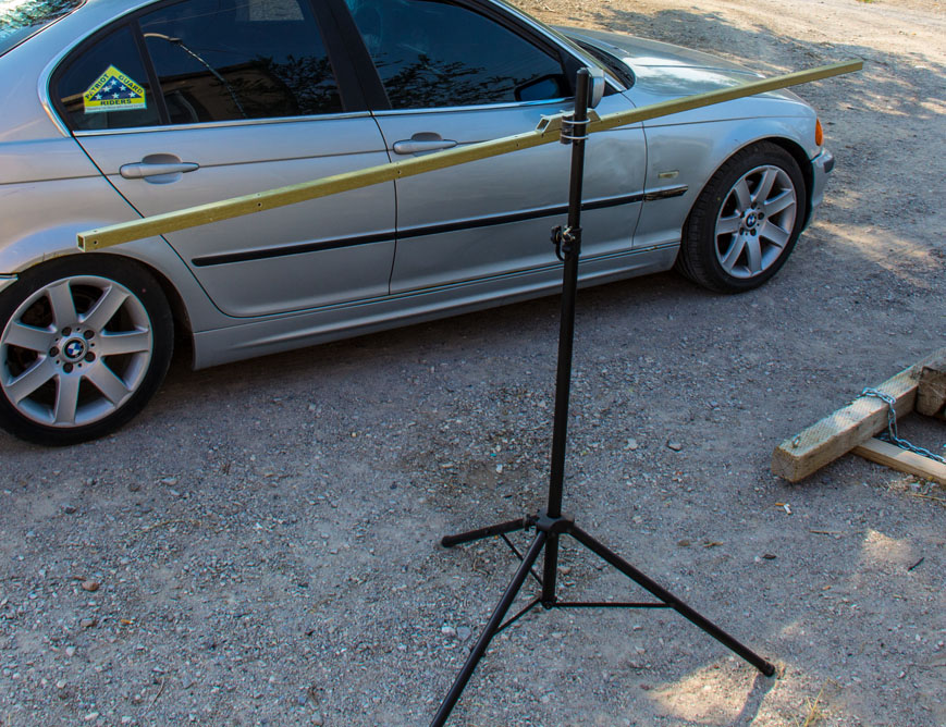 On tri-pod and ready to start assembly. The left end is where reflector starts and goes to the right when eventually completed.
