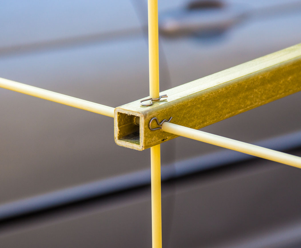 Close up view of how the spreaders are held in place on the boom. 4 clips, 1 on each side. Yes.. even the spreaders are pre-drilled and clips included.