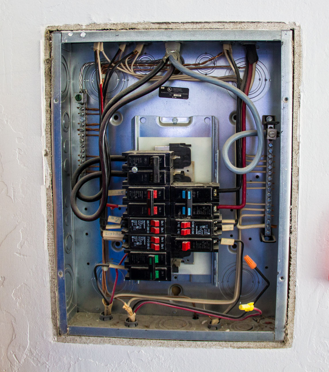 Closer view of breaker box after wire installations.