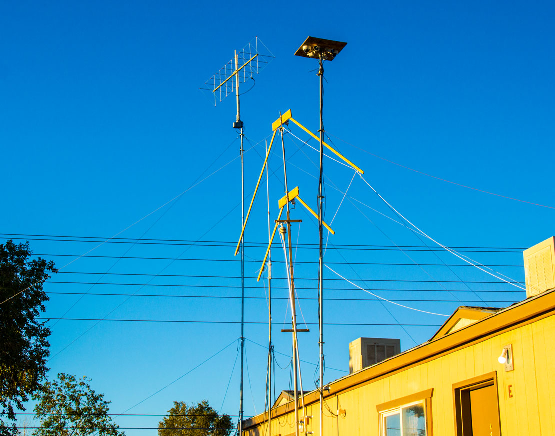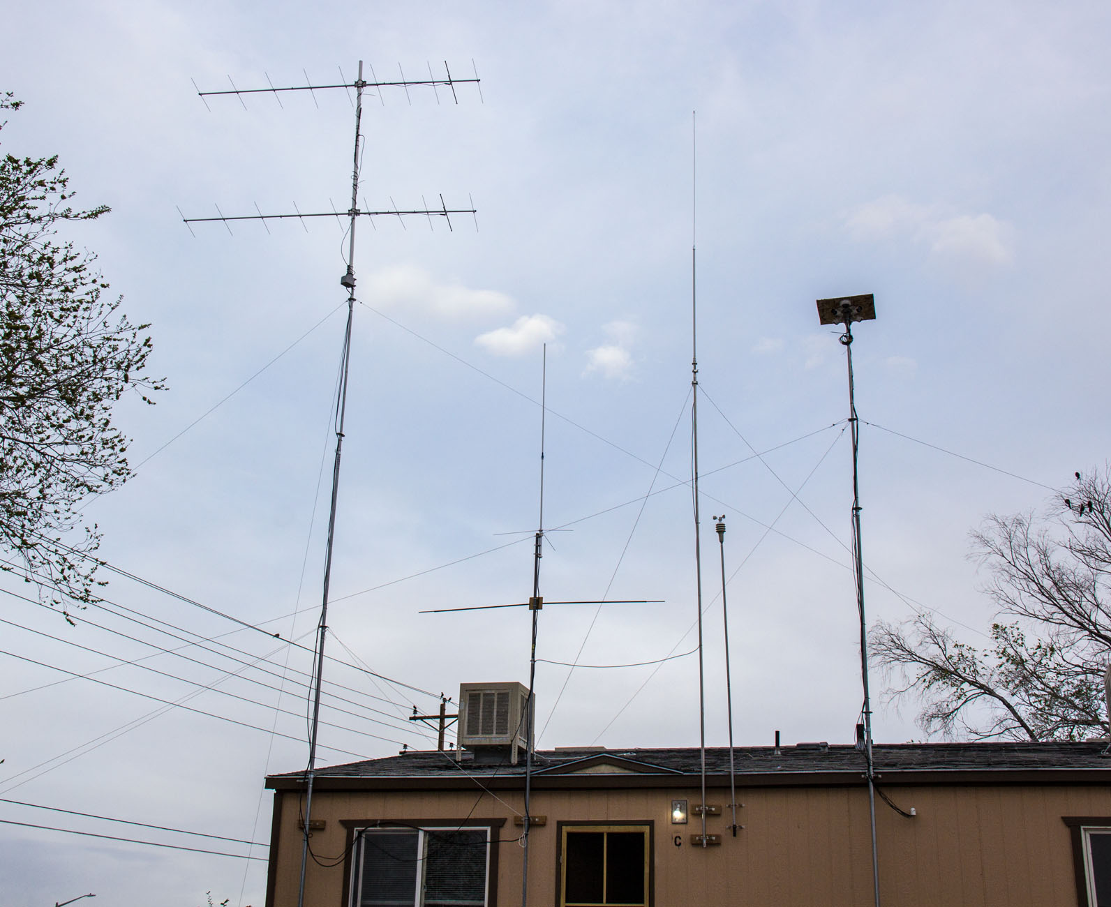 All I have right at this time, is a TRAM 1480, 2 mtr - 440 mtr dual band base antennna at my home. The ground plane of the antenna is about 25ft up. This particular pic I just recently took and updated April 23rd, 2021, after still gradually getting things setup. The deal in the middle-right is weather sensor about 20ft up. The taller one on right is my security cameras at 30ft. The one to the left of the weather sensor is a 10 meter antenna. The diapole just below the Tram base antenna, is a homebrew 6mtr I built and put up back in February 2021. Only tried it once, but it's there. Using it for 6mtr SSB, which is dead for nowdays. I did have 2 of the Cushcraft A-148-10T beam antennas up and operational now at 40-50 feet as of March 19th, 2021. The weather finally cooperated for a few days good enough to bring the whole thing and single beam down, then add the 2nd beam back up there to it all. See the "MY PROJECTS" link for photo details during the process, and also other neat stuff.