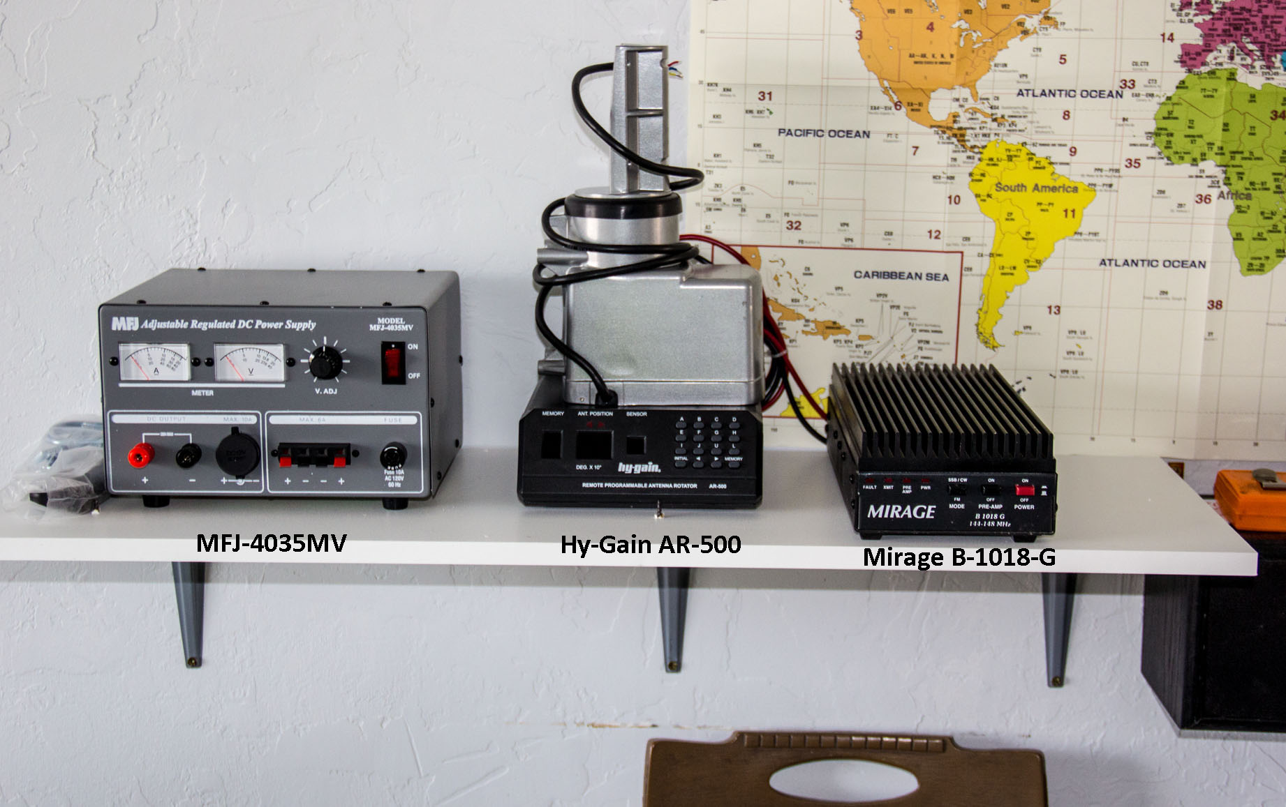 **This is some of my newest stuff I just got on August 24th, 2020. *On the left is a MFJ-4035MV 35amp Variable power supply. *On the right is a Mirage B-1018-G 2mtr FM & SSB 160watt amplifier. *In the middle is a Hy-gain AR-500 programmable rotor control. *I did get a Cushcraft A148-10T 2mtr beam antenna, which is up and running. *This is what it is all looking like. Got it all set up and working now.