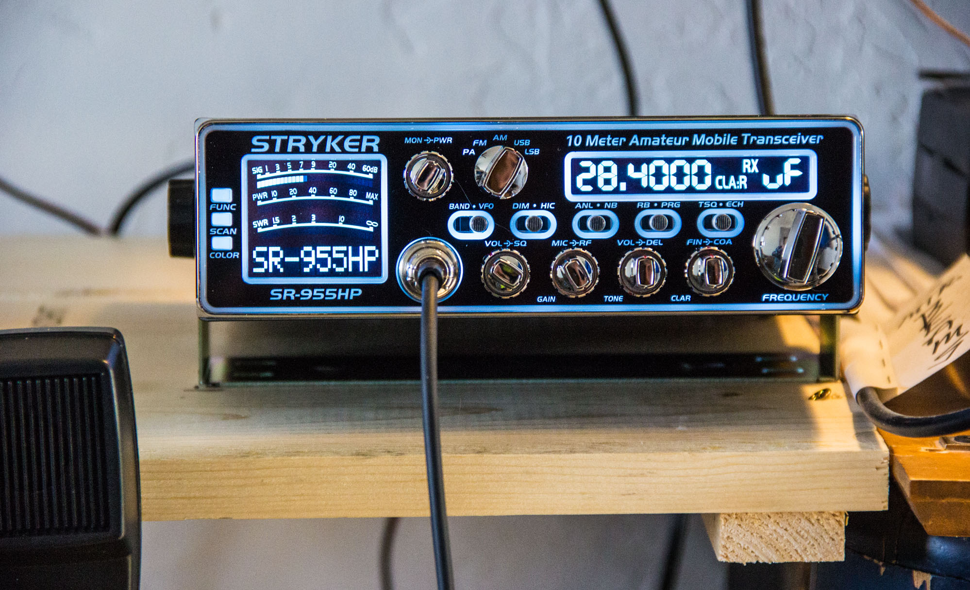 **This is my newest radio addition, which is a Stryker 80-90 watt 10 meter radio. Got it on April 21st, 2021. I know what yer thinkin.. Why git a separate 10 meter radio, when my Yaesu FT-818ND already has 10 meters in it? Well.. this Stryker radio has 80-90 watts. My 818 radio only has 6 watts max. That way, I not having to get a separate amplifier just for 10 meters. For now, I have it hooked up to a Patriot 10 meter vertical base antenna at 30 feet to ground plane area. All I plan on for 10 meter operations, is the 28.400 USB areas. Eventually will be getting a 10 meter horizontal omni sqaulo antenna for it. Up higher too!